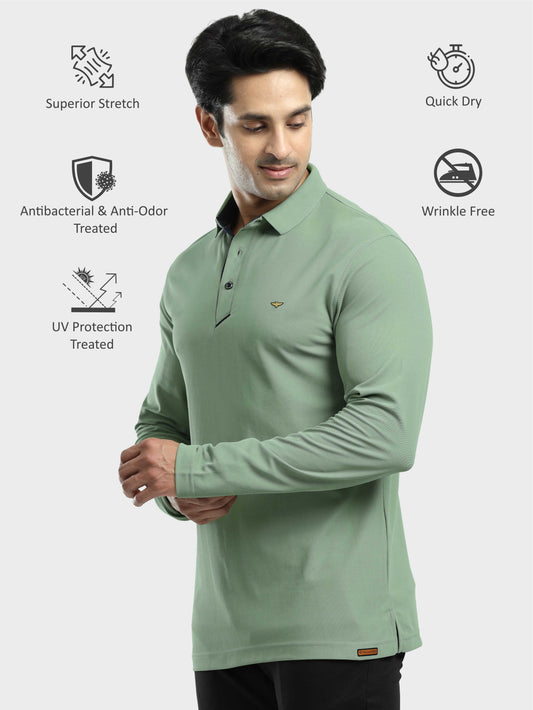 Men's Full Sleeve Polo T-Shirt - Misty Green | Feather Touch Feel | Odour Resistant | Wrinkle Free | Quick Dry | Stretchable | Anti-Static | UV Resistance |