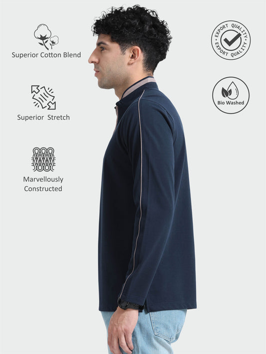 Navy Blue Henley Full Sleeve Polo Tshirt For Men