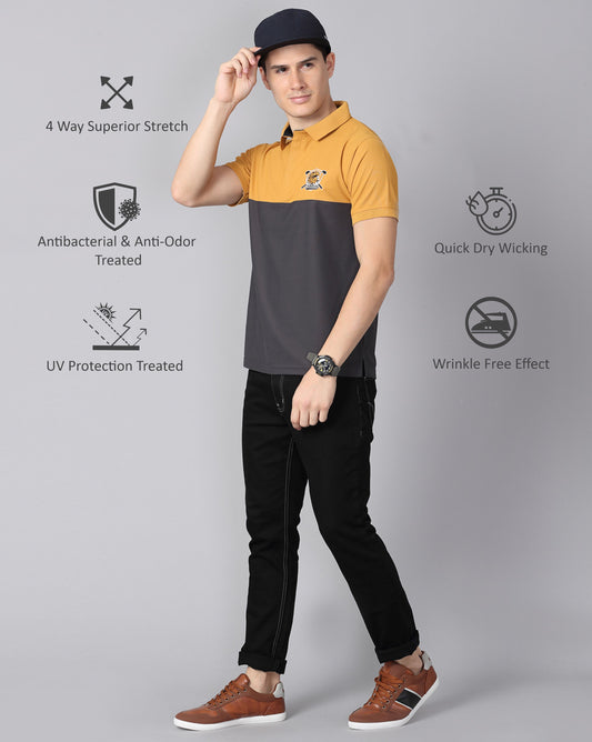Mustard-Dark Grey Men's Half & Half Polo T-Shirt | Quick Dry | Stretchable | UV Protected | Wrinkle & Odour-Free