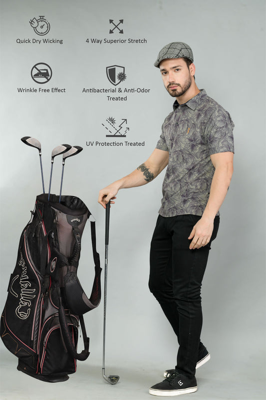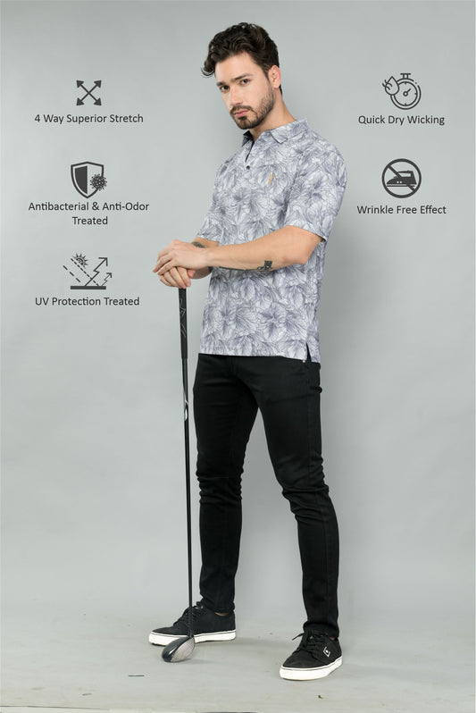 Moose Grey Men's Floral Print Golf Polo T-Shirts | Quick Dry | Stretchable | UV Protected | Wrinkle & Odour-Free