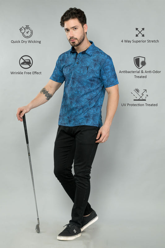 Blue Men's Floral Print Golf Polo T-Shirts | Quick Dry | Stretchable | UV Protected | Wrinkle & Odour-Free