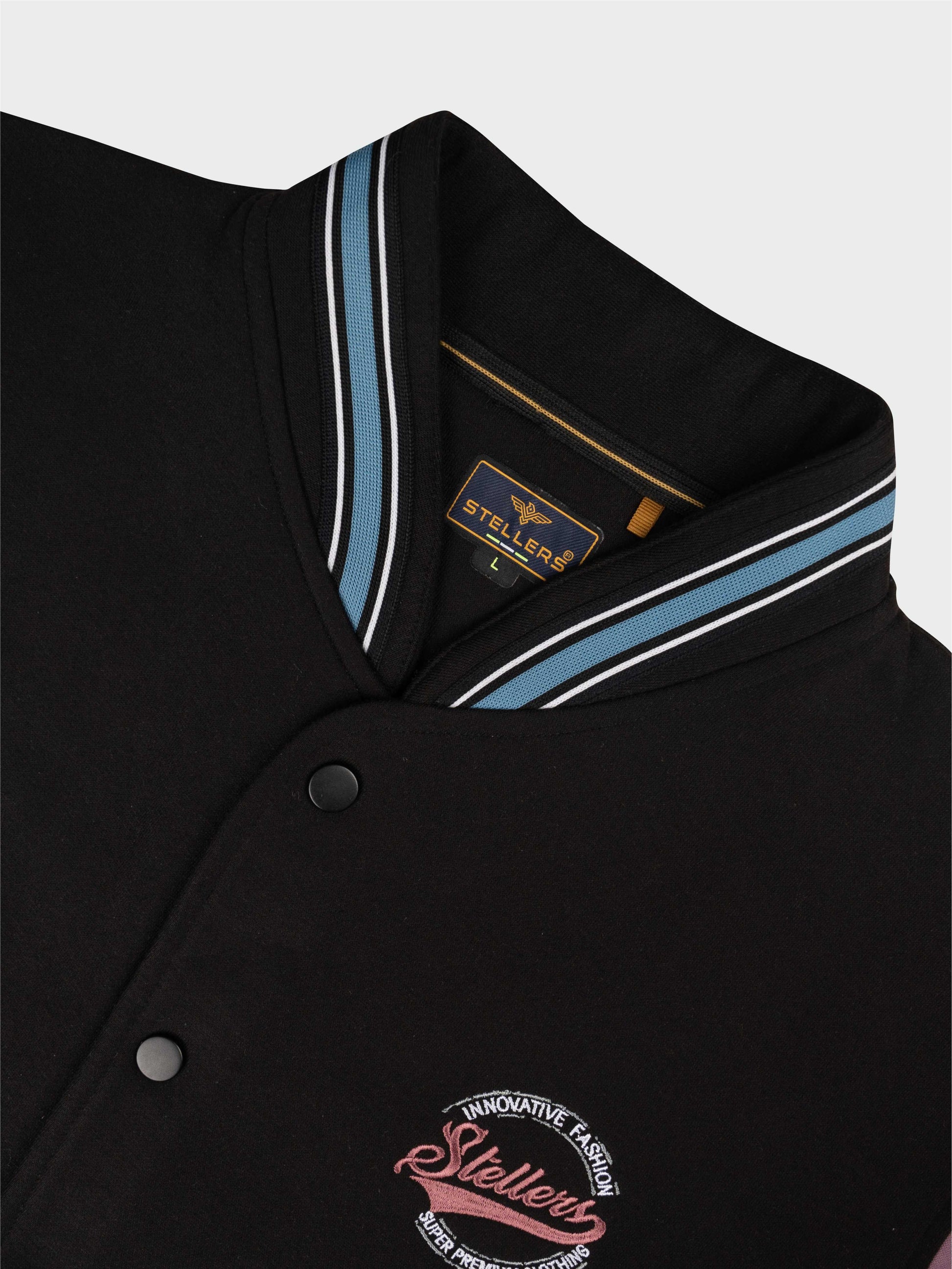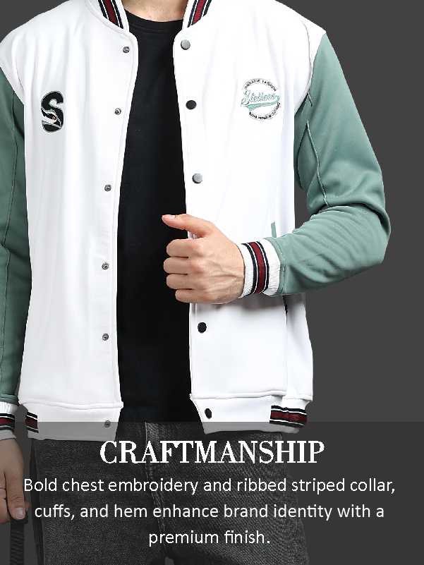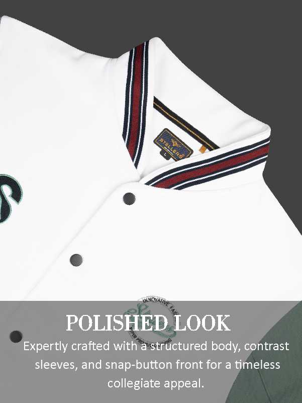 Crafted with a modern varsity-inspired design, this jacket features a smooth, structured body paired with contrast sleeves for a sharp street look, enhanced by striped ribbed trims and a snap-button closure that give it a refined collegiate edge. Clean paneling along with subtle branding embroidery adds a touch of distinction, while the soft, durable knit blend offers comfort, warmth, breathability, and long-lasting shape retention. Effortlessly versatile, it pairs well with basic tees, slim-fit denim, joggers, or casual chinos, and completes the look with sneakers or mid-top shoes for a clean, contemporary appearance.