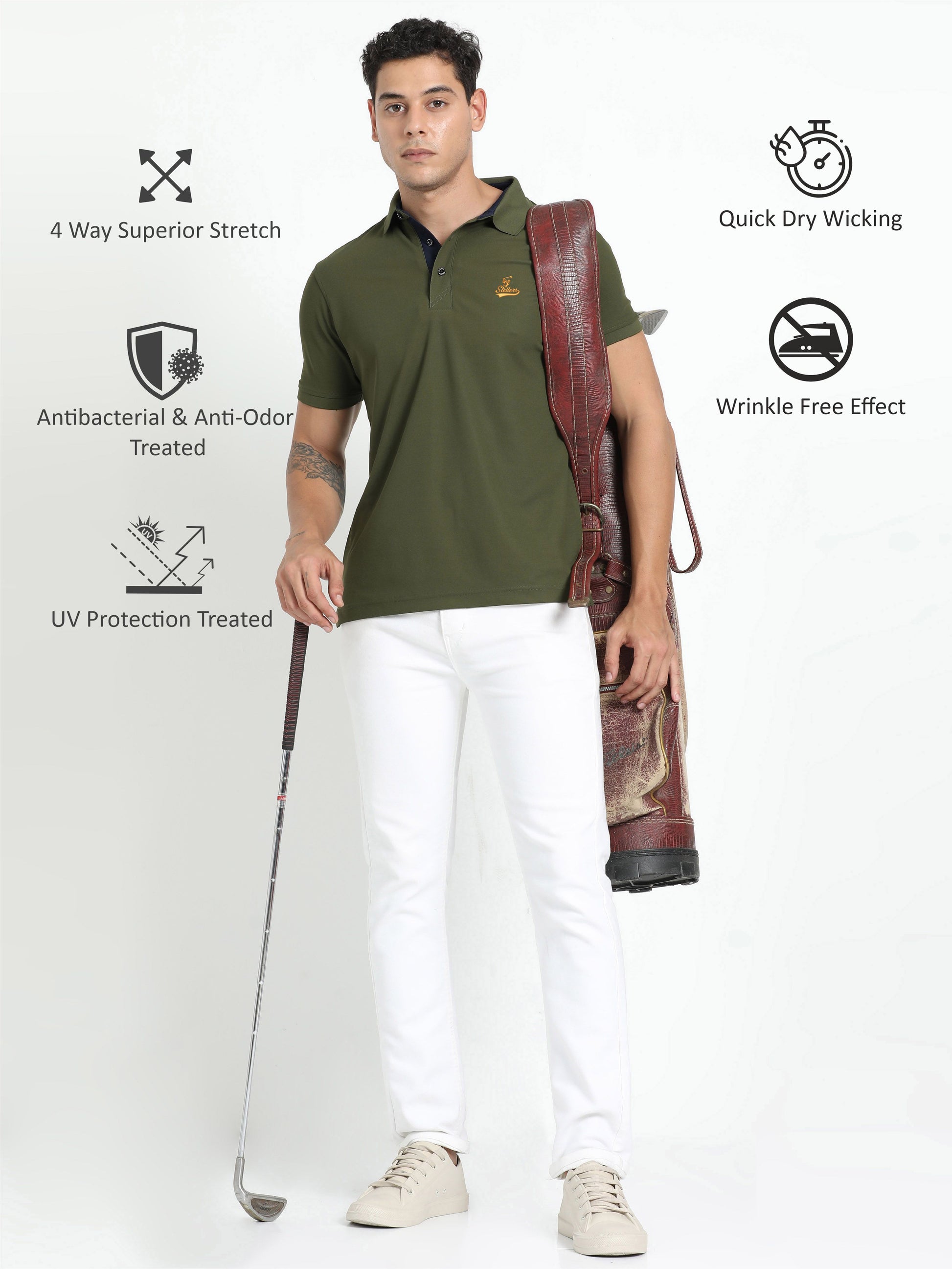Men Olive Green Signature Golf Polo T-Shirt | Quick Dry | Stretchable | UV Protected | Wrinkle & Odour-Free