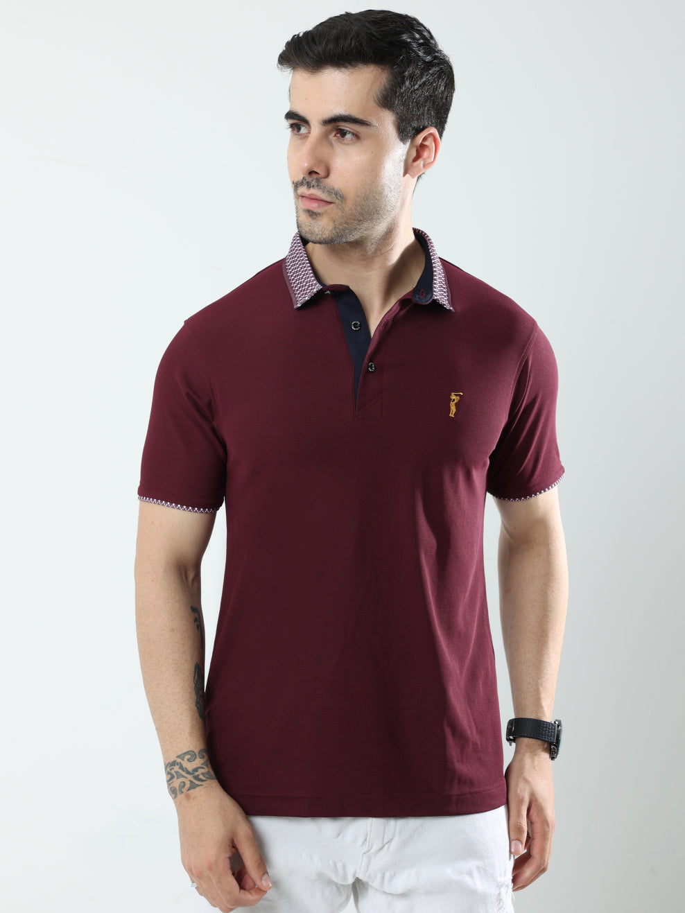 Wine Men's Jacquard Collar Polo T-Shirt | Quick Dry | Stretchable | UV Protected | Wrinkle & Odour-Free