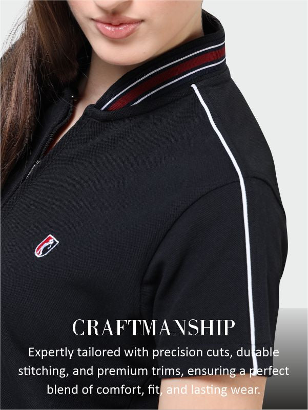 Women Black Zipper Chinese Collar Polo T-shirt | Premium Cotton | Stretchable | Feather touch feel | Sustainable | Breathable | Light Weight