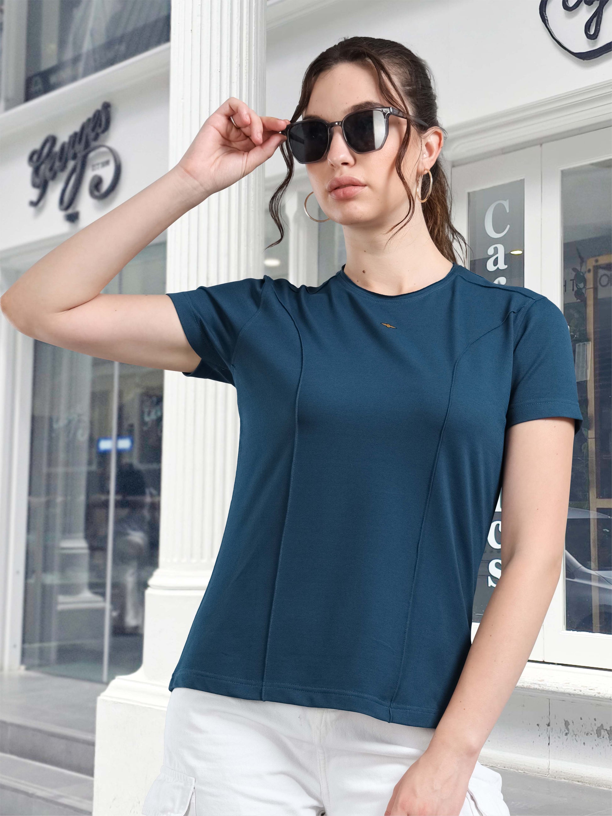 This stellers women’s T-shirt showcases a sleek, modern silhouette with curved seam lines that create a slim, functional shape. Crafted from Spiumo Cotton a premium blend of fine cotton, Cream of polyester, and spandex which offers exceptional stretch, feather-soft comfort, and outstanding breathability. The structured crew neckline, short sleeves, and subtle branding add a touch of refined, elegant styling, making it ideal for both active and casual wear. Designed for all-day comfort, it combines moisture-wicking performance with quiet sophistication in every movement. Pair it effortlessly with high-waisted leggings, tailored joggers, or relaxed denim for a versatile and elevated everyday look.